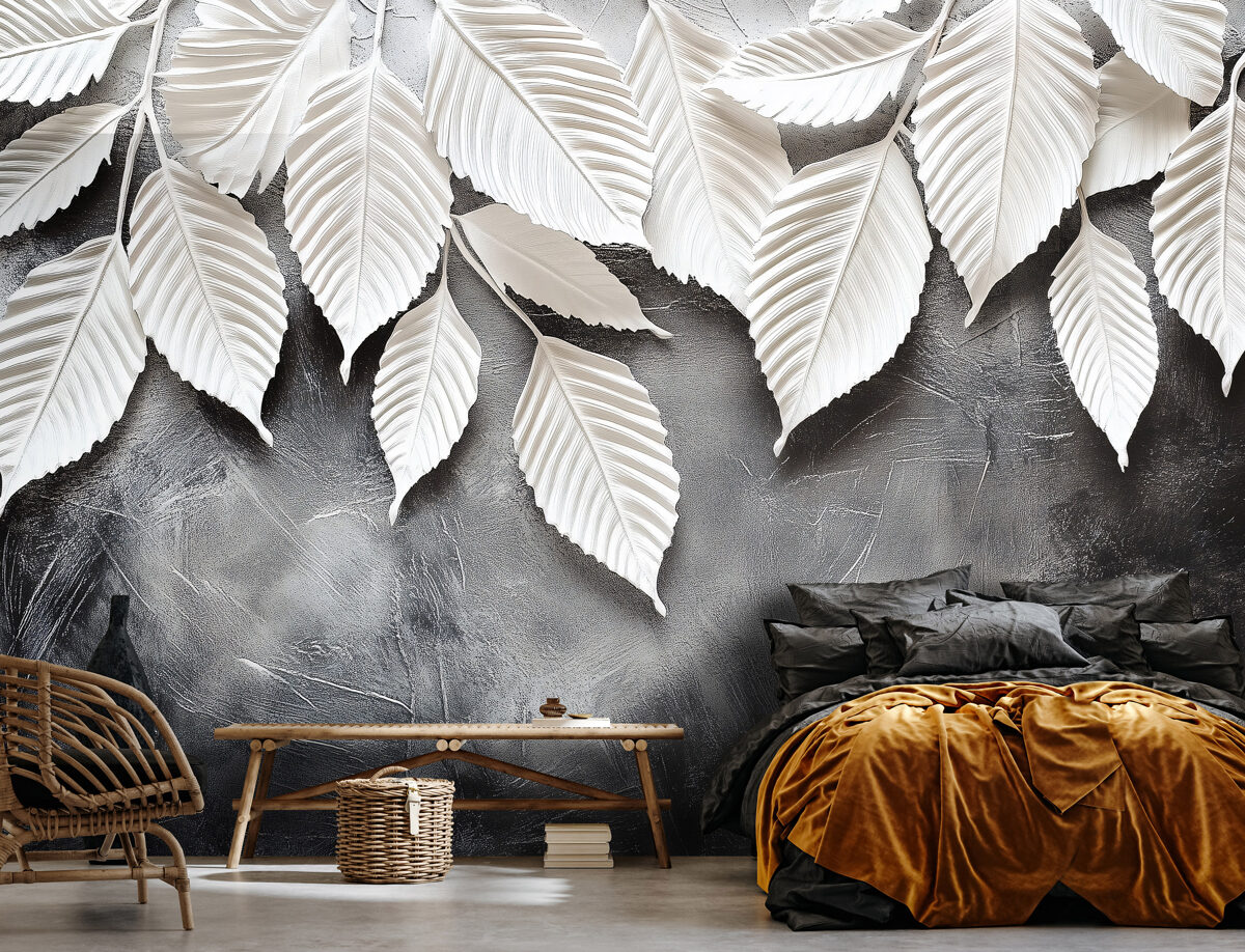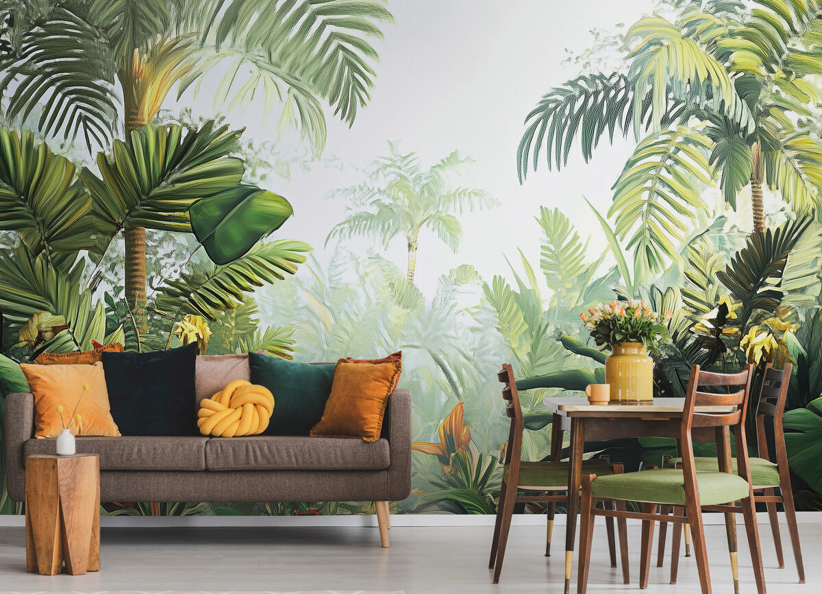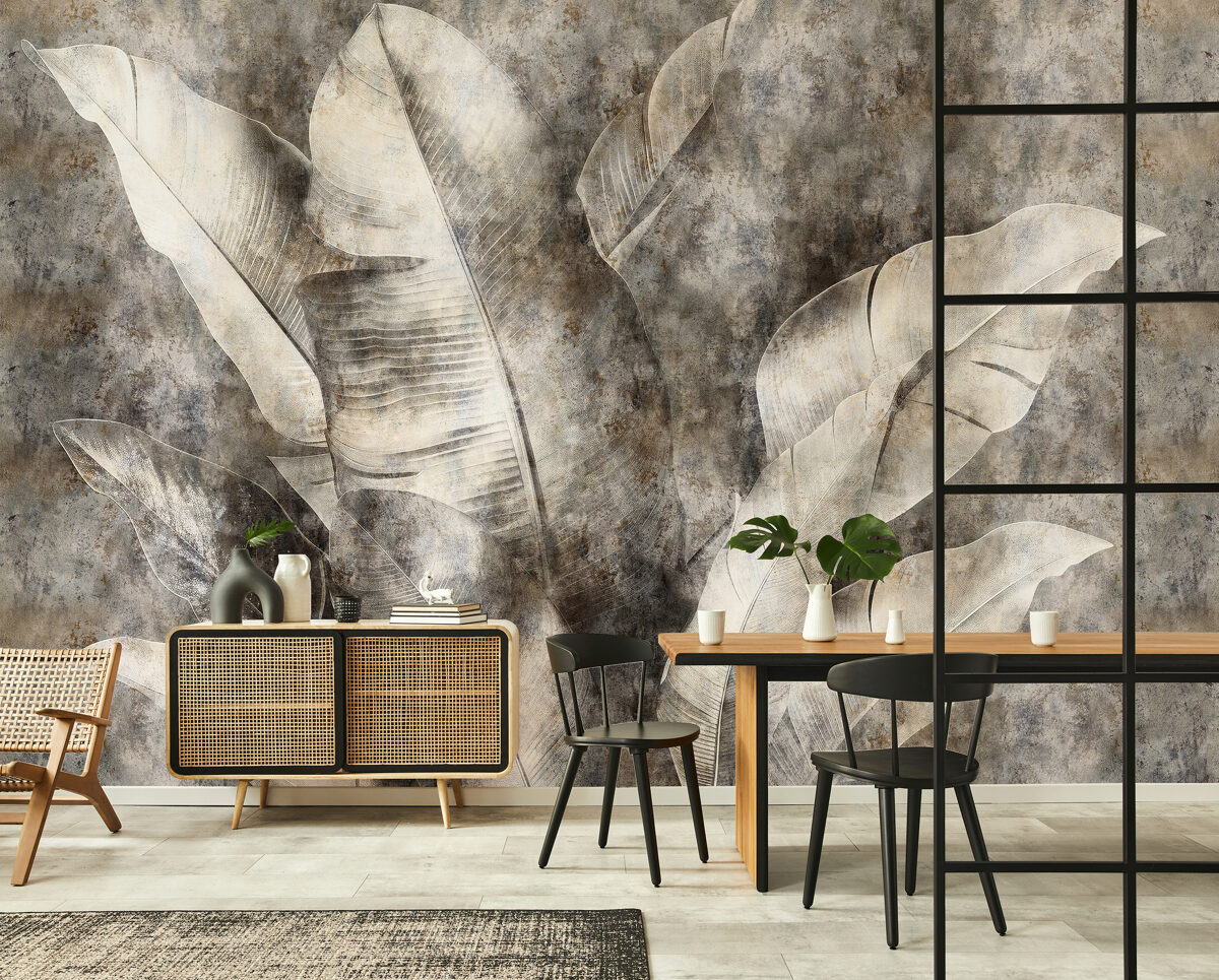 - Tropiskie un botāniskie zīmējumi: Lielizmēra lapas, ziedi, eksotiski dzīvnieki un kukaiņi. Tie piešķir telpai dinamiku, dzīvīgumu un spilgtu akcentu.